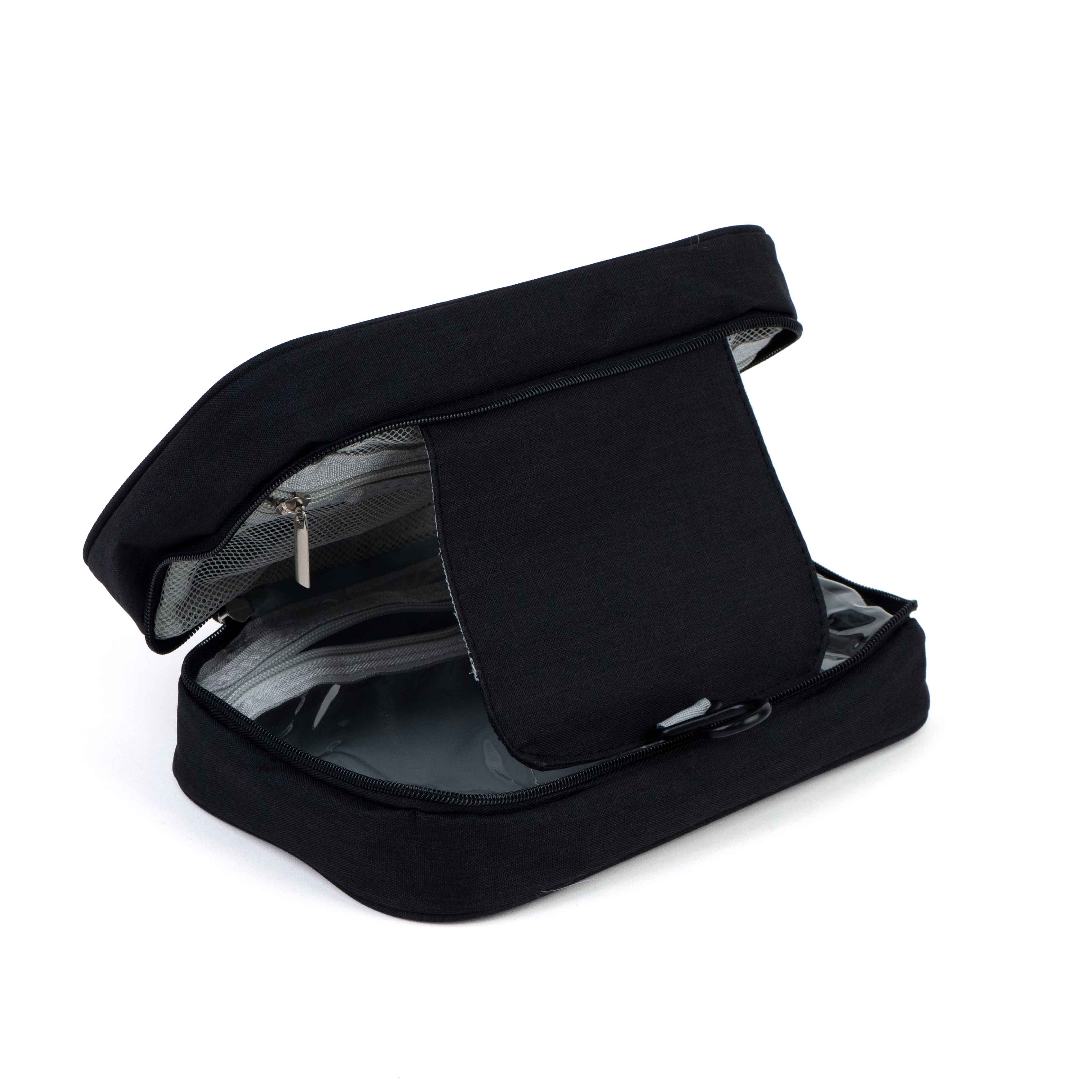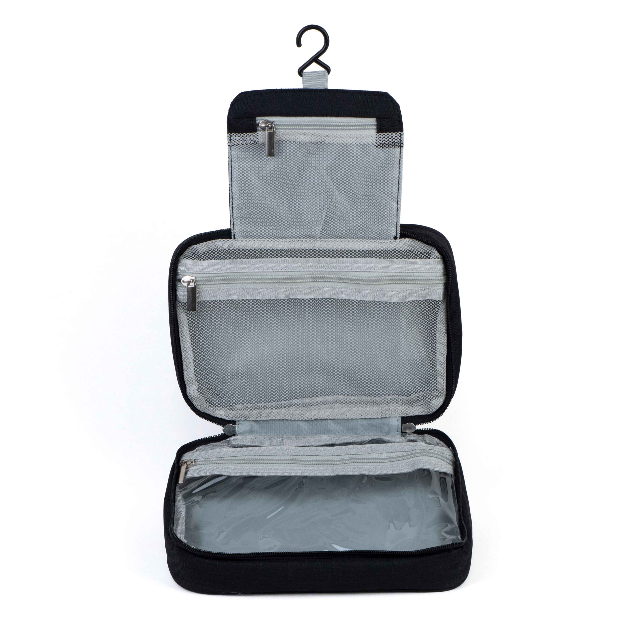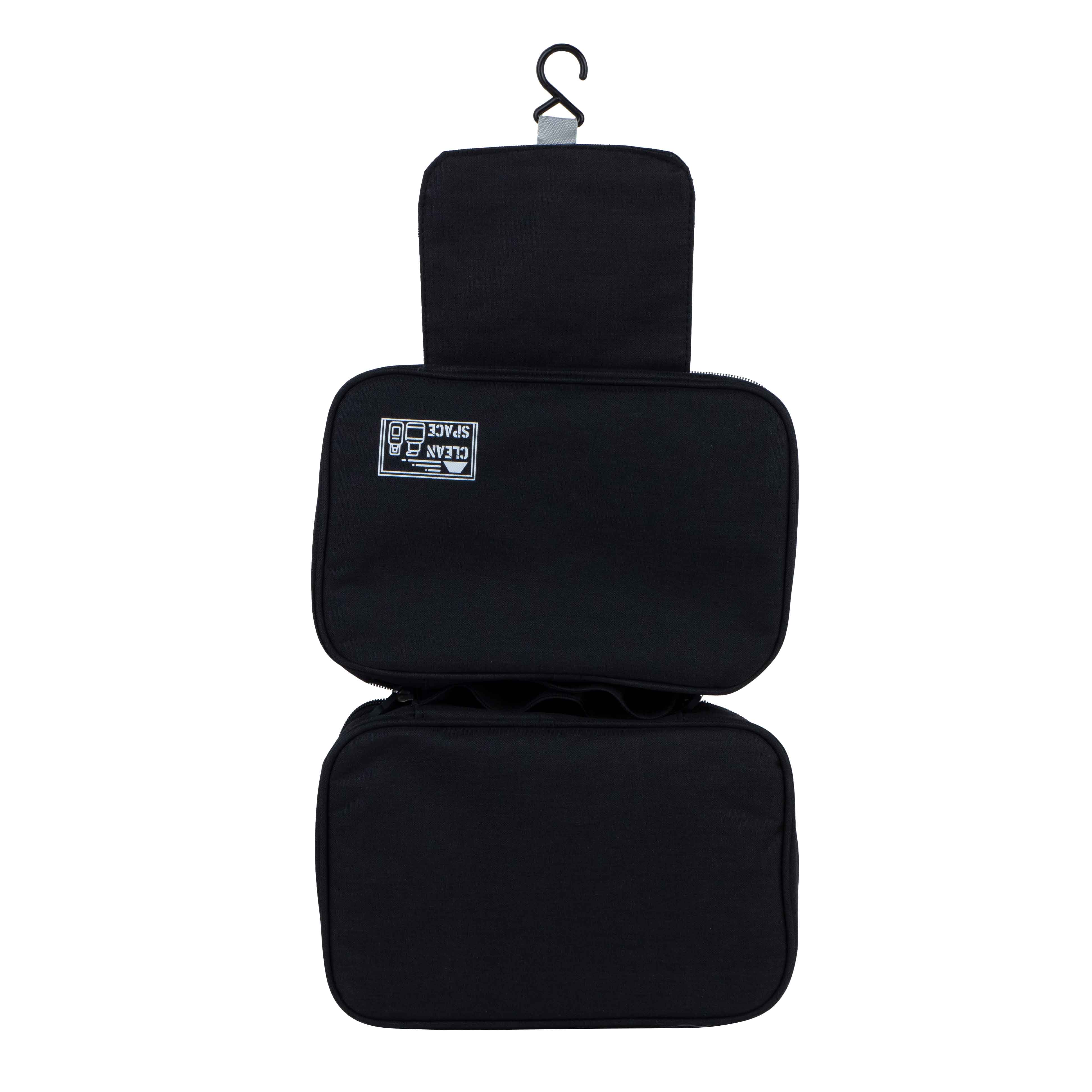 This toiletry bag features a hanging design with a sturdy hook at the top, allowing users to hang it conveniently in various settings (such as hotels or bathrooms), keeping items dry and organized. Its classic black exterior offers a sleek and unisex look, suitable for both men and women.