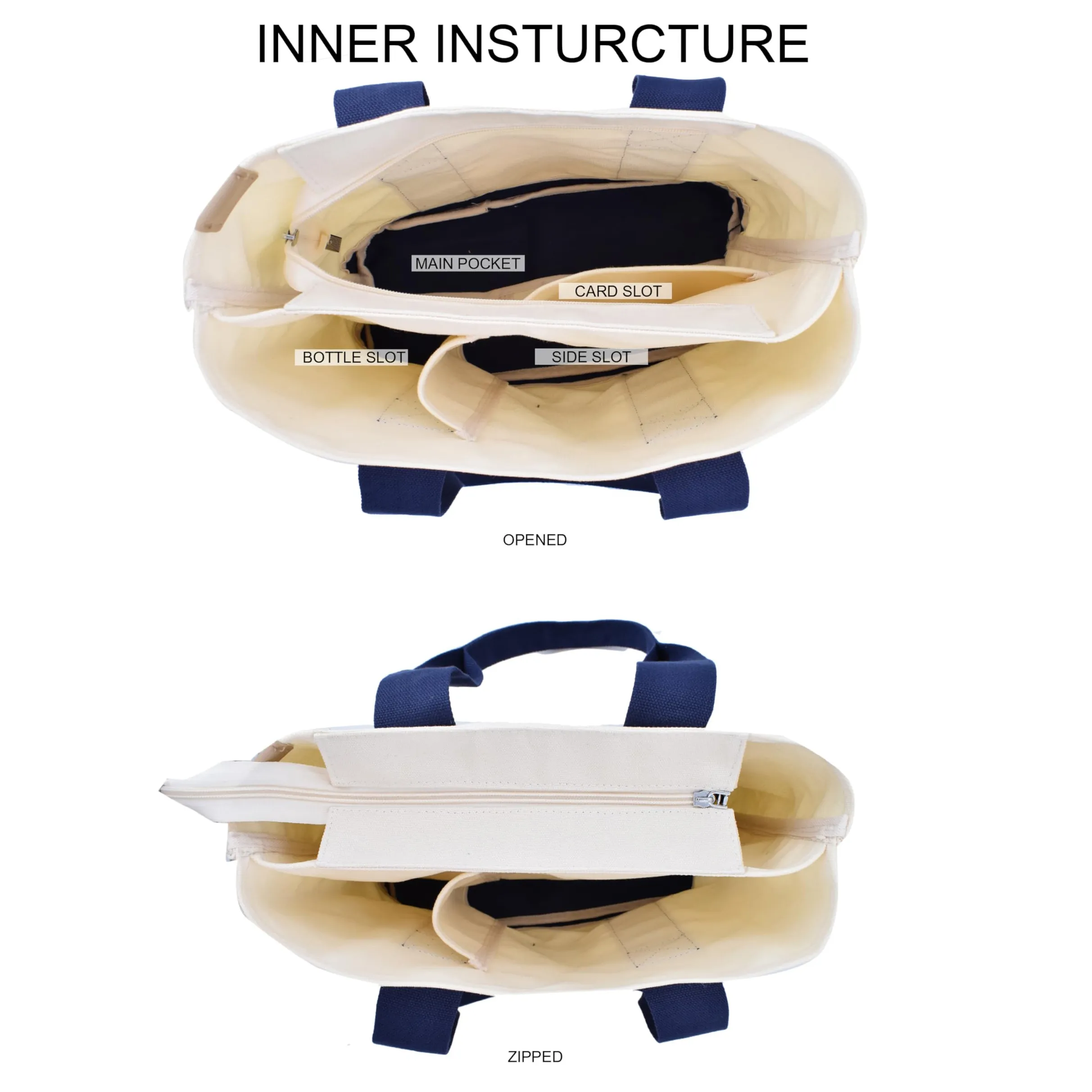This classic canvas tote bag features a secure zipper closure, reinforced navy handles, and a structured base – making it both functional and fashion-forward. Whether you need canvas totes bag for everyday use oder wholesale tote bags for resale, this model offers unbeatable versatility and value.