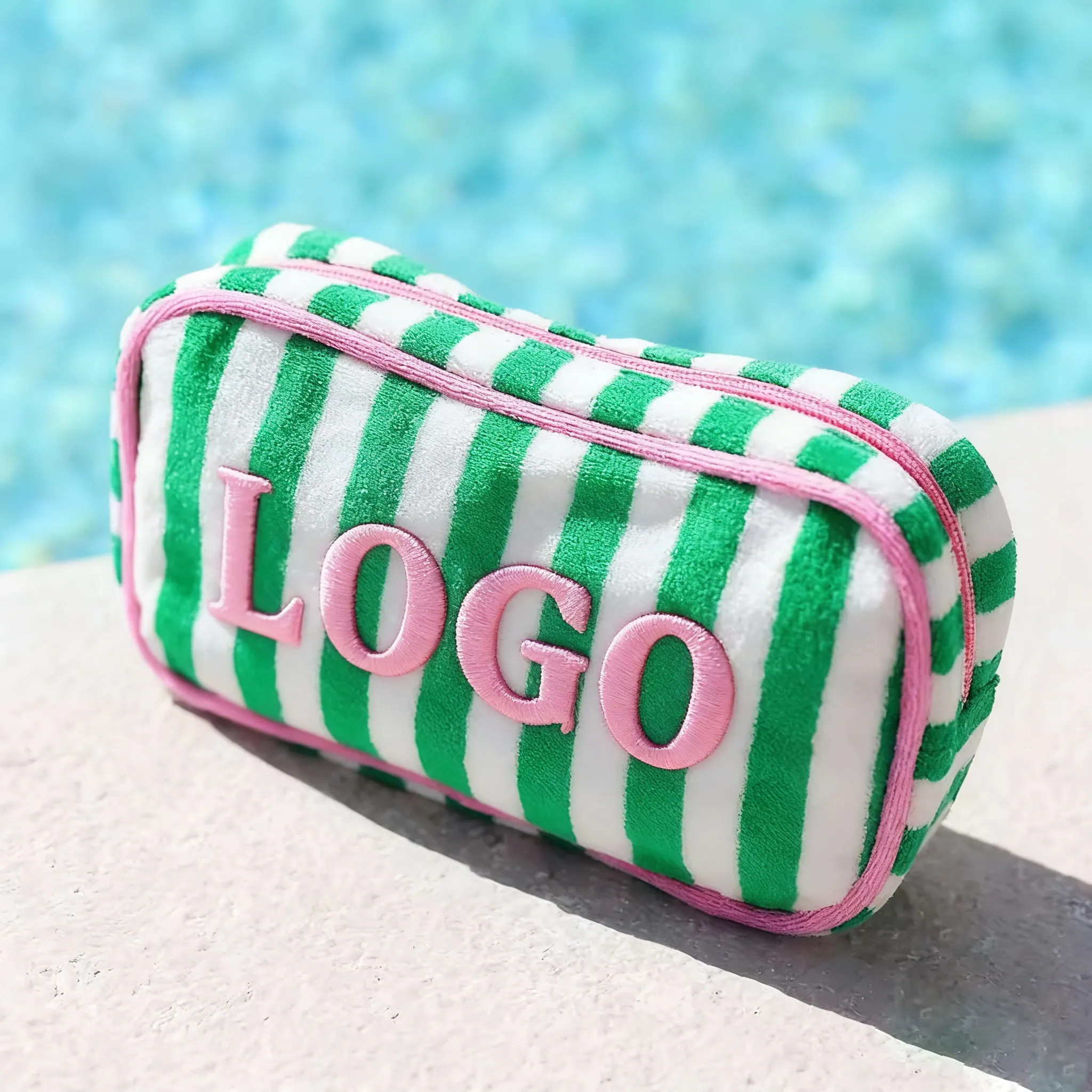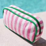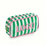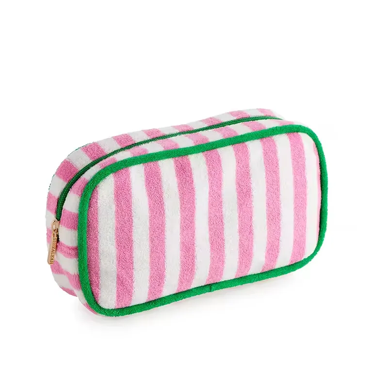 Product Highlights Elevate your brand with our best-selling terry cloth striped makeup bag – the perfect blend of retro charm, luxury feel, and everyday functionality. Featuring bold, high-quality 3D embroidered lettering and vibrant cabana-style stripes, this pouch has become a must-have accessory for beauty, travel, and lifestyle brands worldwide.