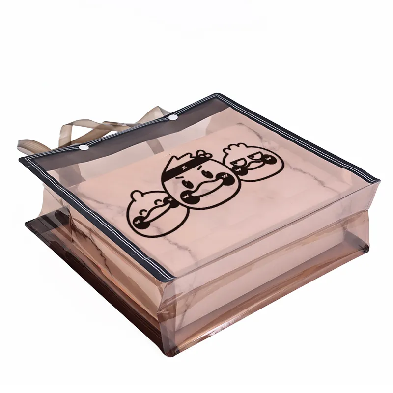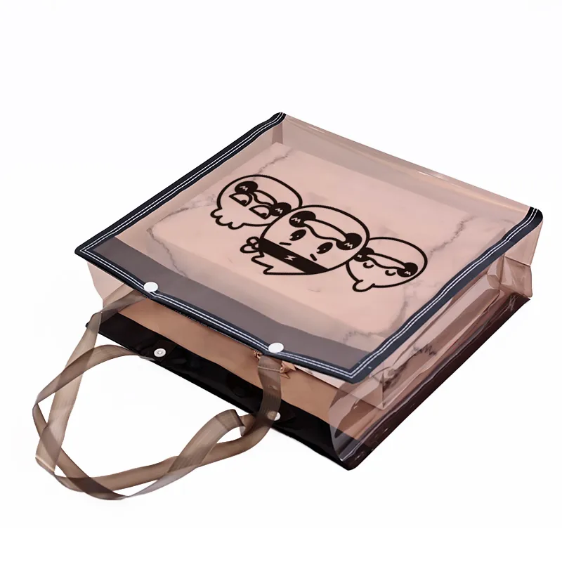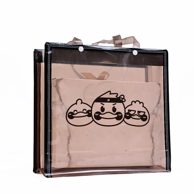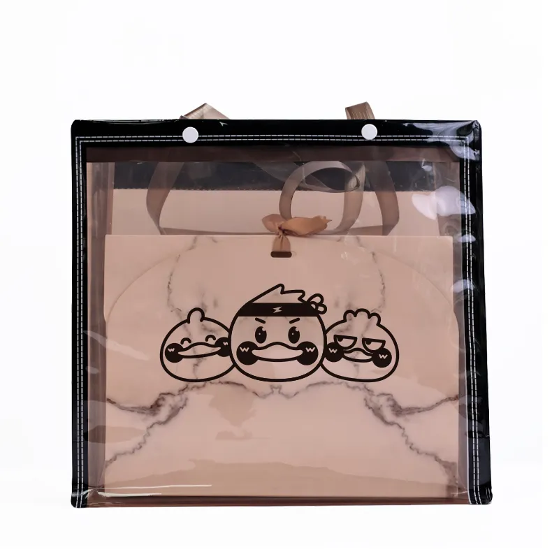 This transparent clear bag combines a sleek modern design with practical functionality. Crafted from high-quality PVC material with reinforced edges for enhanced durability, it features a unique graphic design to add a touch of personality. The transparent exterior allows for easy viewing of the contents, making it ideal for gift packaging, event promotions, shopping, and everyday use. Customization options are available, making it perfect for wholesale needs.